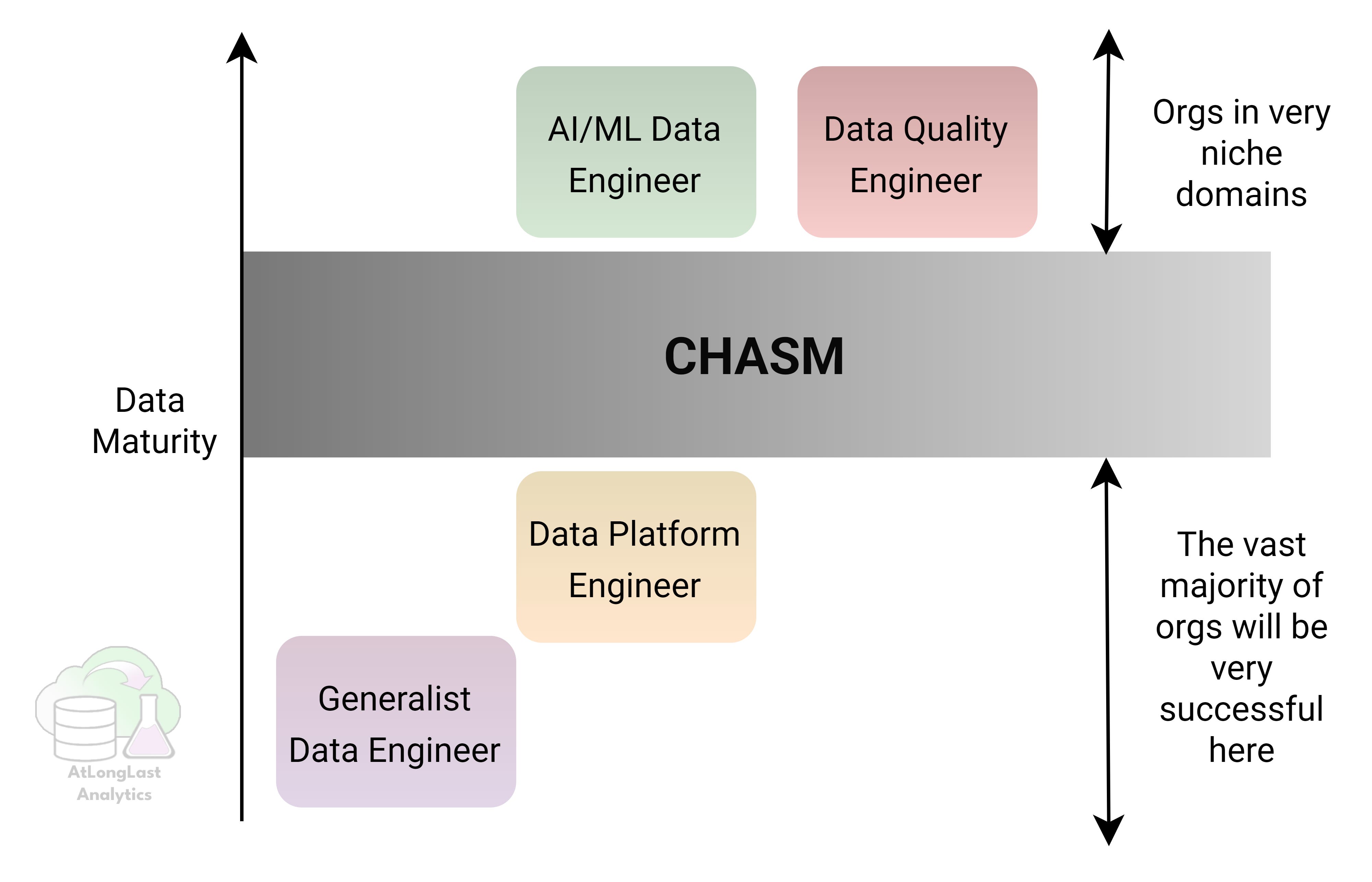 Beyond that lies a clear chasm (see Figure 2(. AI/ML data engineers and data quality engineers only make sense when driven by specific business needs: AI as a core product or revenue driver, or regulatory environments where data quality is mission critical or data errors carry sever consequences. Hiring for these roles without these pressures usually results in expensive data teams that lose C-suite buy-in and end up losing funding or ceasing to exist all together.